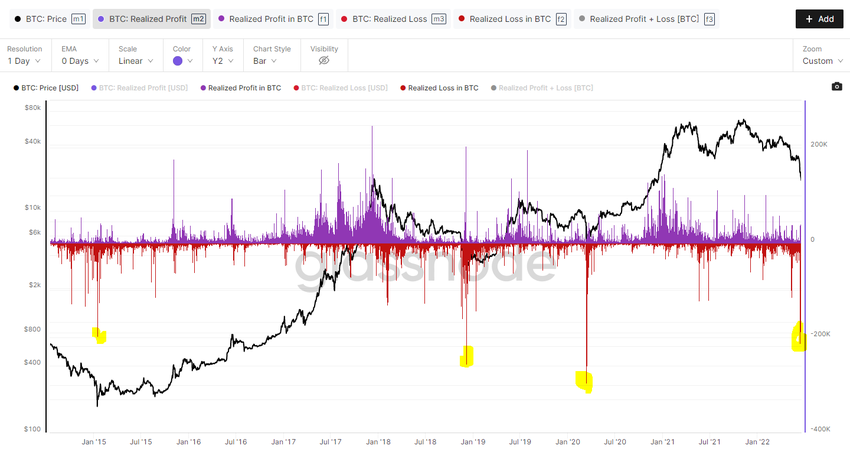 Analis on-chain @SwellCycle mencuitkan sebuah grafik Realized Loss yang dinyatakan dalam BTC sejak tahun 2015. Pada grafik tersebut, ia menyoroti area (kuning) dari kerugian sangat tinggi yang para investor telah alami. Ternyata, penurunan paling parah yang terjadi pada tanggal 13 Juni, merupakan kerugian terealisasi yang tertinggi ke-3 dalam sejarah Bitcoin.