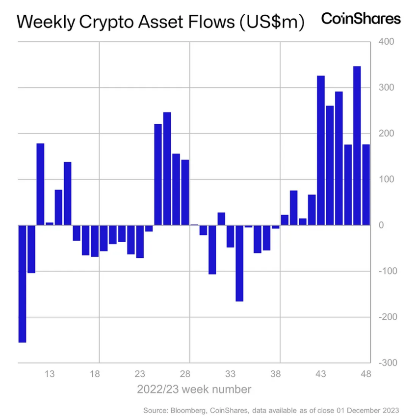 Terakhir, arus masuk aset digital, yang dipimpin oleh Bitcoin dan Ethereum, mencapai US$176 juta minggu lalu. Menurut CoinShares, jumlah tersebut menjadi level tertinggi dalam 10 minggu terakhir sejak Oktober 2021. Tak ayal, ini pun turut menunjukkan meningkatnya minat pasar serta investasi pada aset-aset kripto ini.