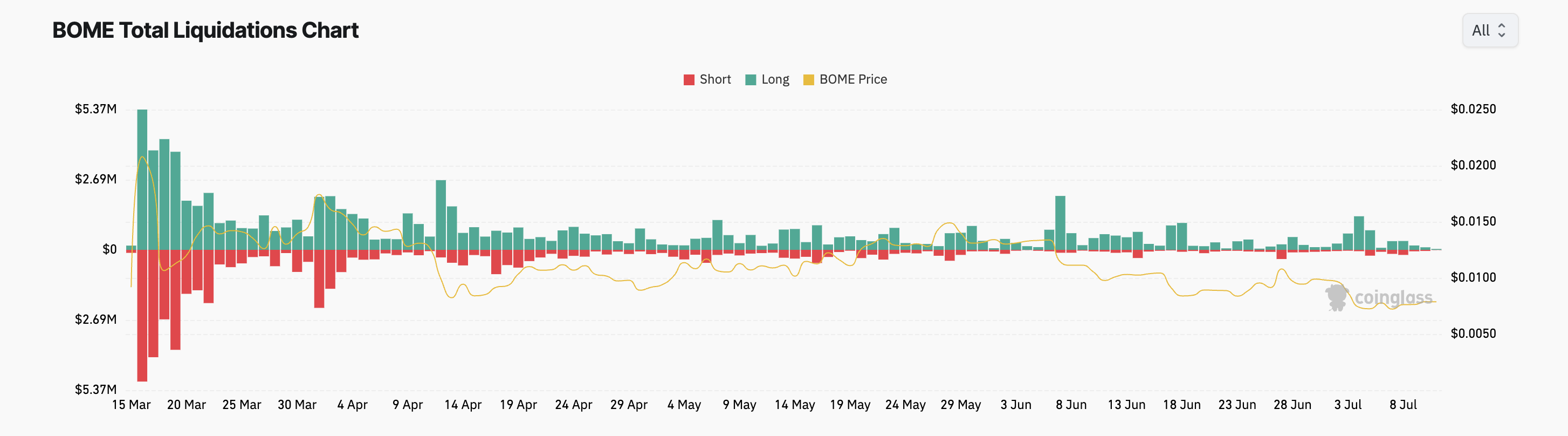 Kala open interest suatu aset meningkat seiring dengan harganya, ini kerapkali menegaskan kekuatan dan juga berlanjutnya tren naik. Menariknya, walaupun terjadi reli harga BOME dalam 3 hari terakhir, BOME mencatatkan lebih banyak likuidasi long ketimbang likuidasi short.