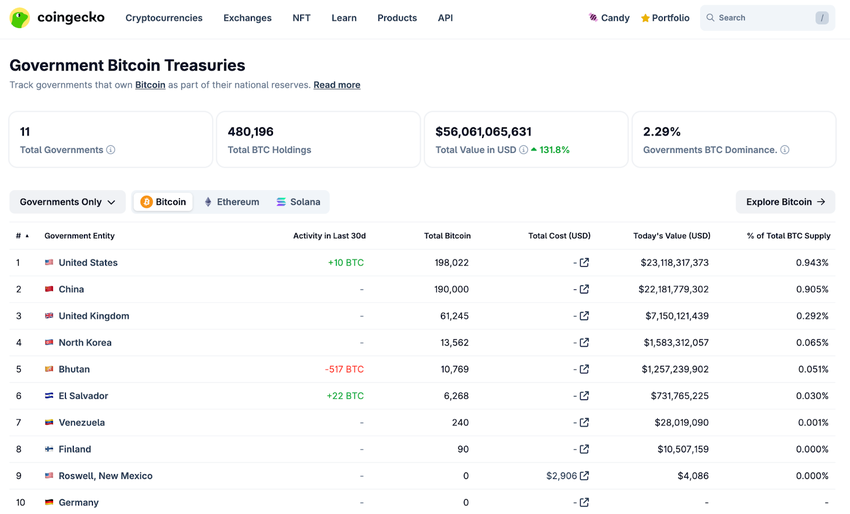 Pemerintah di seluruh dunia semakin beralih ke Bitcoin. Menurut data CoinGecko bulan ini, sebelas pemerintah secara kolektif memegang 480.196 BTC, senilai sekitar US$56 miliar—sekitar 2,29% dari pasokan Bitcoin. Daftar ini termasuk Korea Utara (13.562 BTC), Bhutan (10.769 BTC), dan El Salvador (6.268 BTC).
