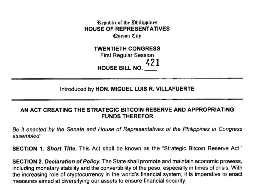 House Bill No. 421, diajukan pada 22 Agustus 2025, mengarahkan Bangko Sentral ng Pilipinas (BSP) untuk membeli 2.000 BTC setiap tahun selama lima tahun.