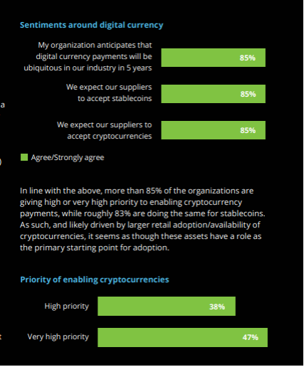 Dalam survei yang dilakukan oleh Deloitte di Amerika Serikat, terungkap bahwa banyak perusahaan yang berniat membuka akses terhadap pembayaran berbasis kripto. Sebanyak 85% di antaranya menjadikan hal tersebut sebagai prioritas tinggi dan 83% responden melakukan hal yang sama untuk stablecoin.