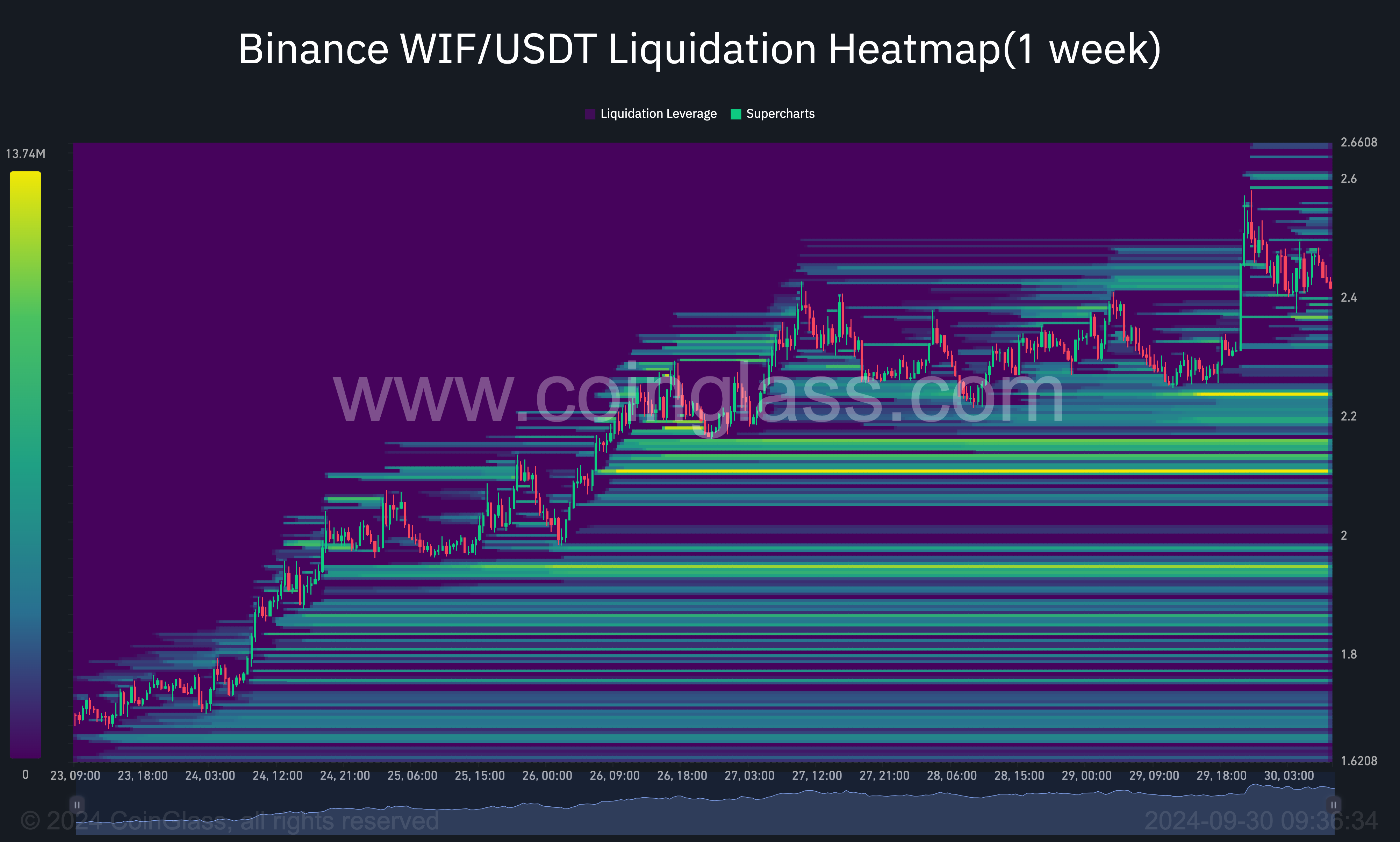Dari sudut pandang teknis, harga WIF mencoba naik melewati US$2,48, tetapi telah kembali ke US$2,38. Selain itu, grafik harian menunjukkan zona pasokan yang mencolok pada US$2,85, menunjukkan bahwa meme coin mungkin telah mengalami kemunduran jika mencapai wilayah tersebut.