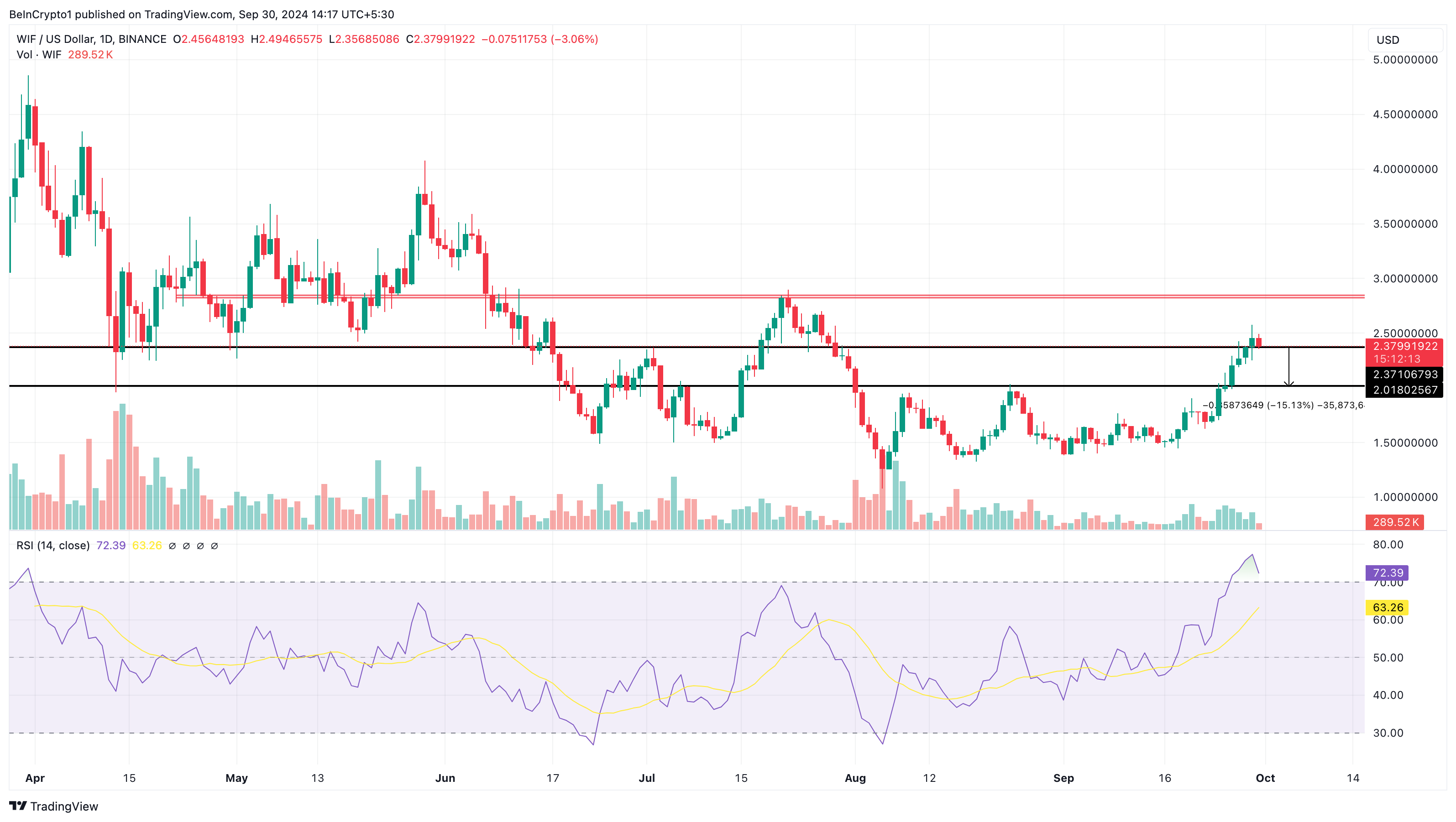 Lebih lanjut, Indeks Kekuatan Relatif (RSI), yang mengukur momentum, overbought. Akibatnya, pembacaan telah turun dan bisa mempercepat tren menurun WIF. Dari penampilannya, harga WIF bisa melihat penurunan 15%, berpotensi menjatuhkannya di bawah US$2,25 dan turun ke US$2,01.
