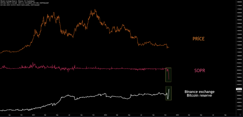 Di sisi lain, ada sebuah tren yang menarik untu kita perhatikan, yaitu kondisi ketika cadangan bursa Binance melonjak, hal yang sama juga menyebabkan kehancuran pada SOPR BTC. Sebagai informasi, Spent Output Profit Ratio (SOPR) BTC adalah indikator yang berfungsi mengukur rasio untung dan rugi sesuai dengan perubahan harga beli dan jual koin. Pada 13 November lalu, indikator ini telah anjlok ke titik 0,87.