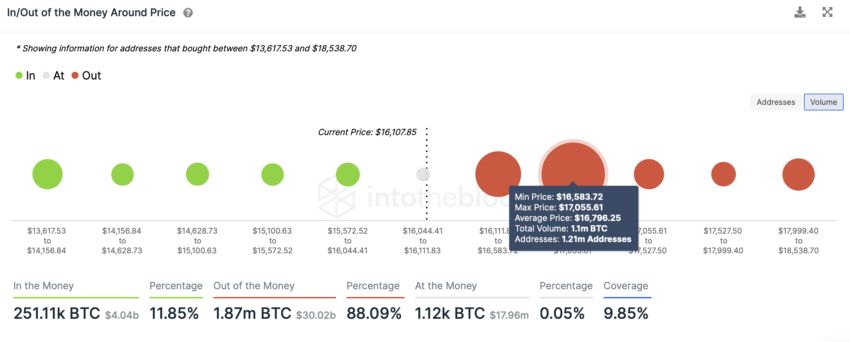 Selanjutnya, jika harga Bitcoin dapat bertahan dengan konsisten di atas level US$16.796 di mana 1,2 juta alamat memiliki 1,1 juta BTC, maka level tersebut dapat menjadi titik support yang kuat.