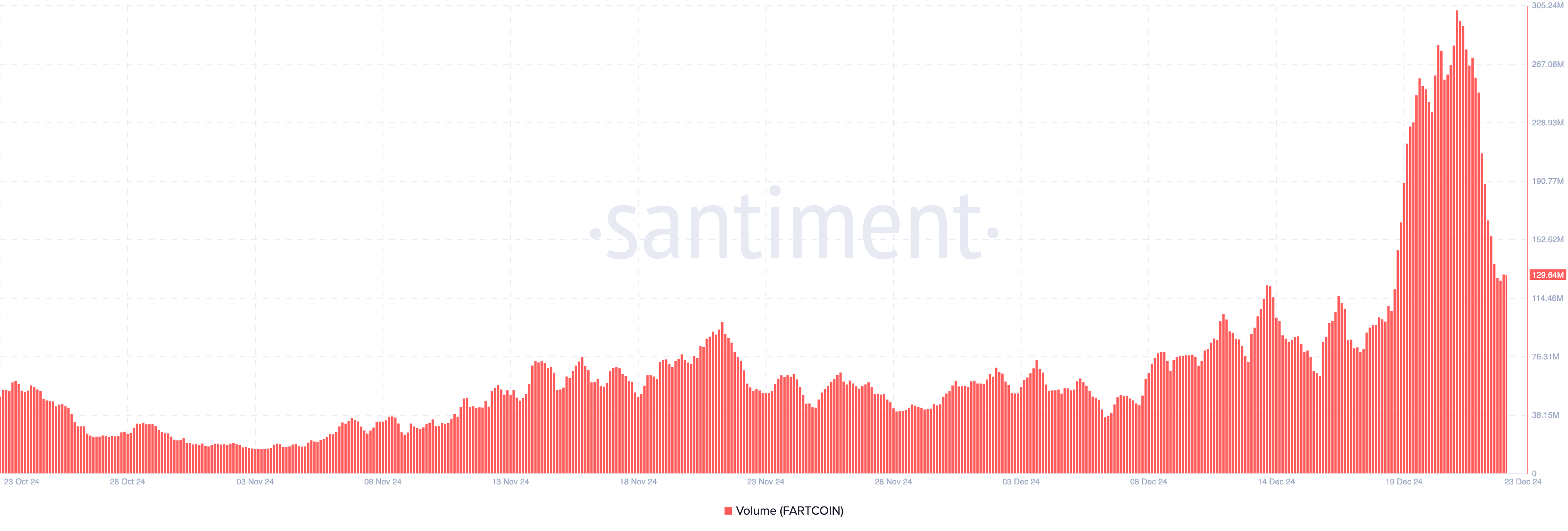 Menurut Santiment, volume perdagangan Fartcoin turun menjadi US$129,64 juta. Volume perdagangan mewakili jumlah total aset kripto yang diperdagangkan dalam jangka waktu tertentu, dan juga mengukur tingkat likuiditasnya di sekitar aset tersebut.