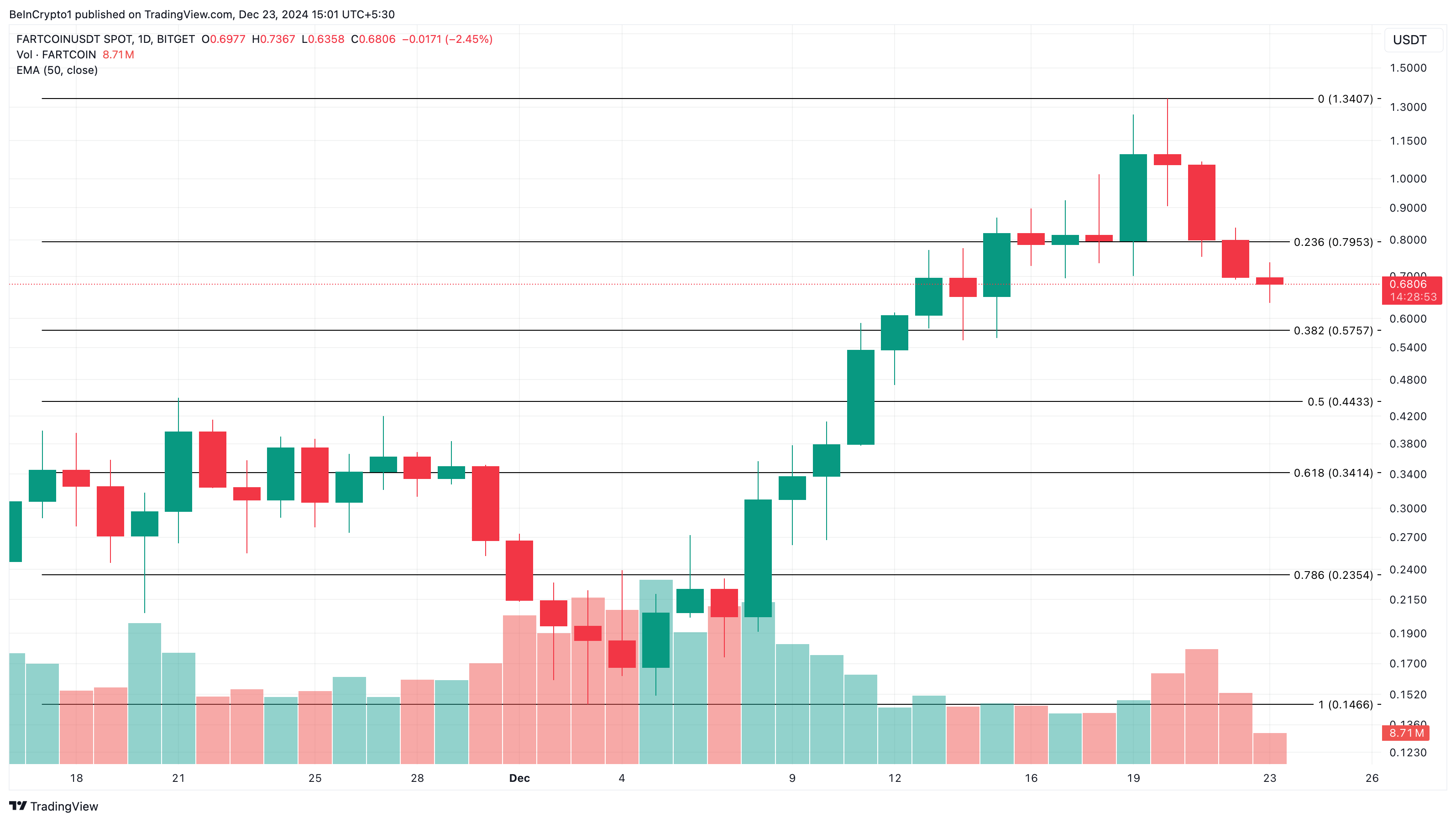 Menggunakan indikator retracement Fibonacci, BeInCrypto mengamati bahwa harga FARTCOIN telah turun di bawah zona support 23,6%. Penurunan di bawah area ini menunjukkan bahwa harga aset kripto ini kemungkinan akan terus jatuh.