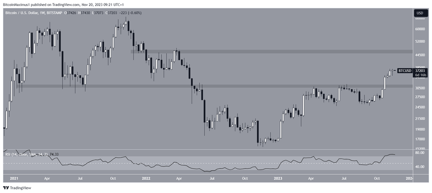 Grafik mingguan Bitcoin menunjukkan bahwa BTC telah meningkat dengan cepat selama lima minggu terakhir. Harga Bitcoin berhasil merebut kembali area horizontal US$31.000 pada awal bulan Oktober lalu.