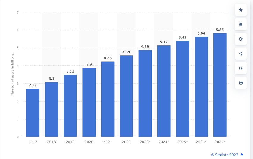 Tangkapan layar di bawah ini menunjukkan bahwa pada tahun 2023, terdapat sekitar 4,89 miliar pengguna media sosial di seluruh dunia. Selain itu, pertumbuhan pengguna diprediksi akan mencapai sekitar 5,85 miliar pada tahun 2027.