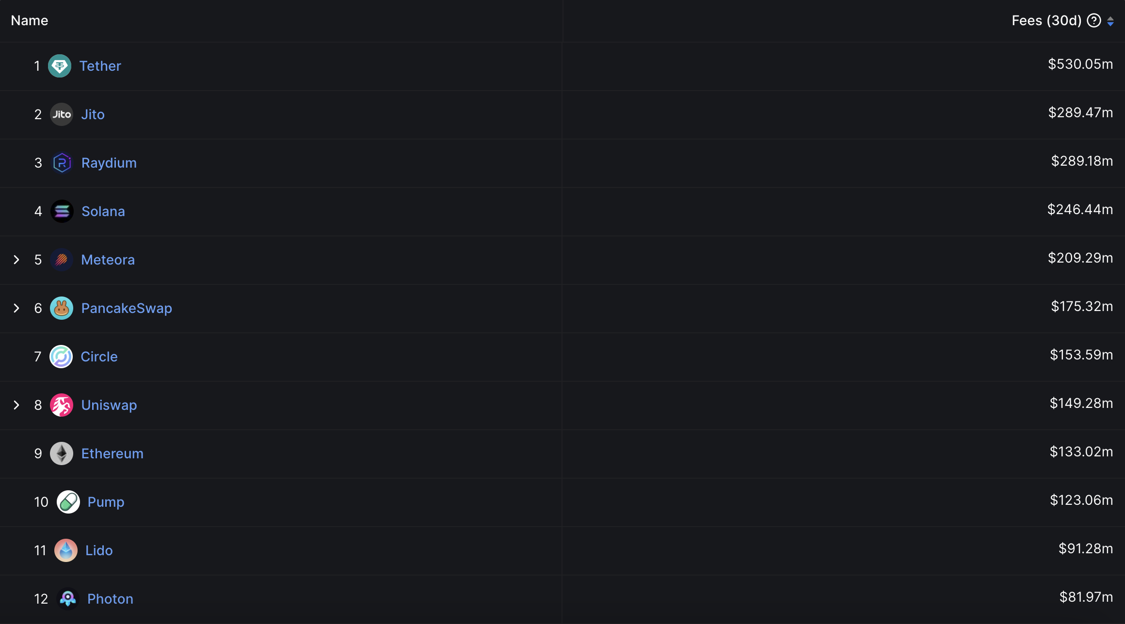 Menariknya, lima dari 10 besar berbasis Solana, termasuk Jito, Raydium, Meteora, dan Pump, yang bersama dengan Solana itu sendiri, telah menghasilkan lebih banyak biaya dibandingkan ETH.