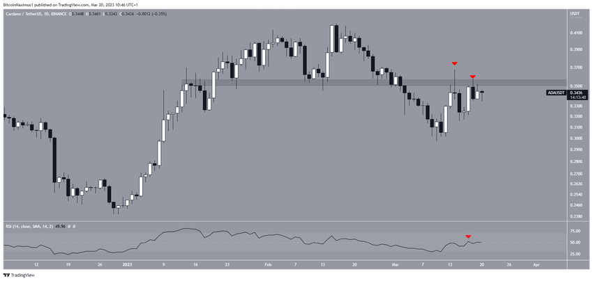 Dalam time frame ini, harga ADA mengalami penolakan dari area resistance US$0,36, sehingga menciptakan upper wick yang panjang dan lower high (ikon merah). Sementara itu, hal ini juga berimpit dengan indikator RSI yang mengalami penolakan dari garis 50.