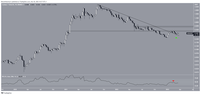 Token ADA adalah native token dari platform blockchain Cardano. Sejauh ini, harga ADA telah jatuh di bawah garis descending resistance sejak mencapai harga tertingginya sepanjang masa (ATH) di level US$3,10 pada Agustus 2021. Aksi penurunan ini akhirnya berujung pada terbentuknya level terendah US$0,23 pada Desember 2022.
