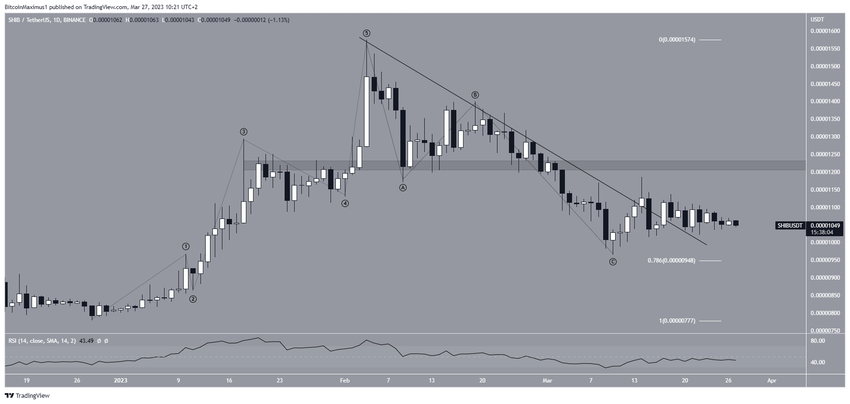 Analisis teknikal dari time frame hariannya menunjukkan bahwa harga SHIB ternyata telah turun di bawah garis descending resistance sejak 4 Feb. Alhasil, aksi turun ini menyebabkan harganya ambrol ke level US$0,0000096 pada 10 Maret. Tapi untungnya, harga SHIB sudah mulai naik lagi sejak itu.