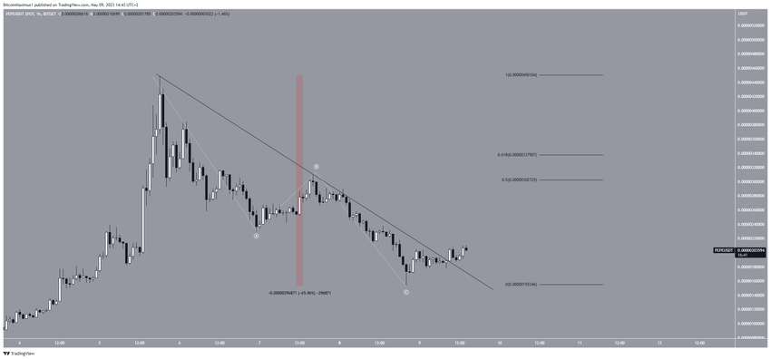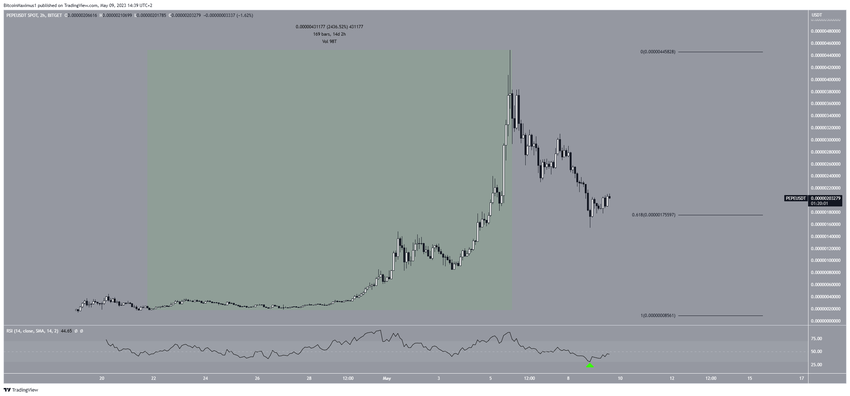 Namun, harga PEPE telah turun sejak itu, dan menyentuh harga minimum US$0,0000018 pada tanggal 8 Mei, sekaligus mencapai level support retracement Fib 0,618 jangka panjang.