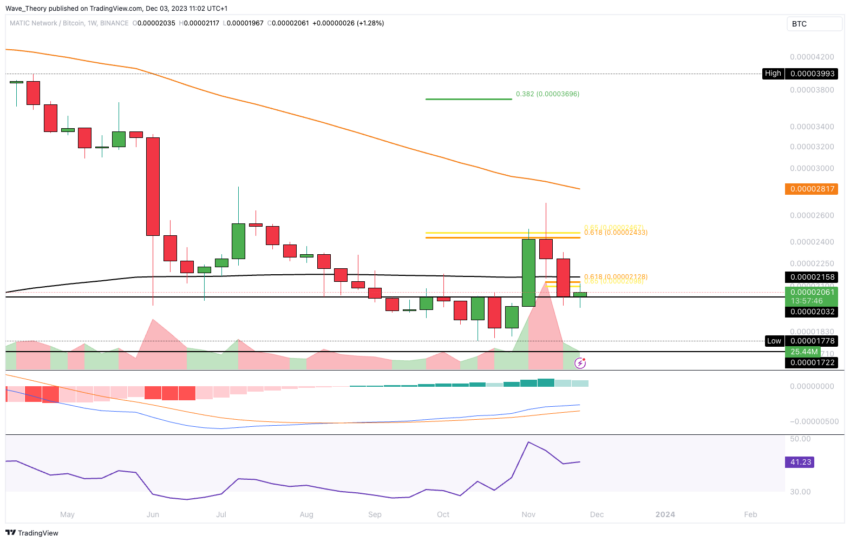 Dalam perdagangannya terhadap Bitcoin (BTC), Polygon (MATIC) baru-baru ini telah menembus level support golden ratio, yang terletak di sekitar 0,0000213 BTC, dalam pergerakan bearish. Namun, sejak itu pula, Polygon menemukan support penting di kisaran US0,0000203 BTC.