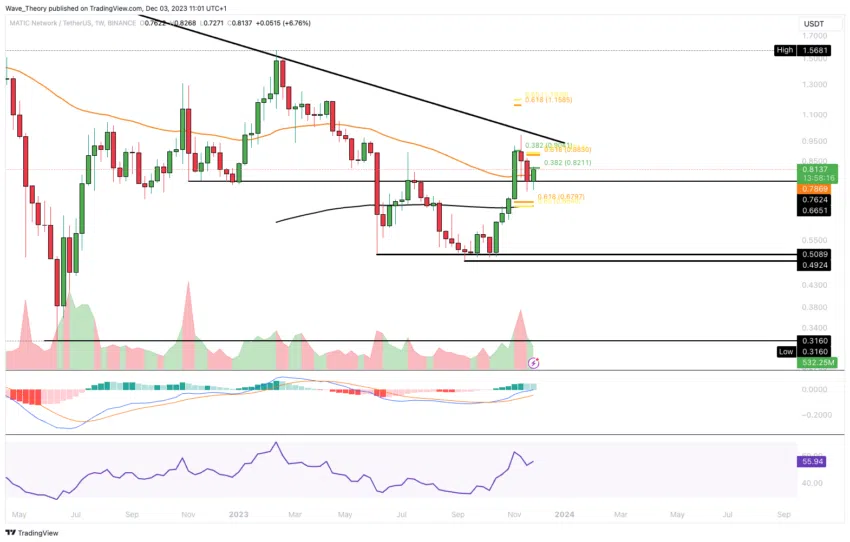 Saat ini, MATIC sedang menghadapi level resistance Fibonacci yang signifikan. Jika Polygon berhasil menembus resistance ini, itu dapat menandakan potensi untuk kenaikan harga yang lebih besar lagi.