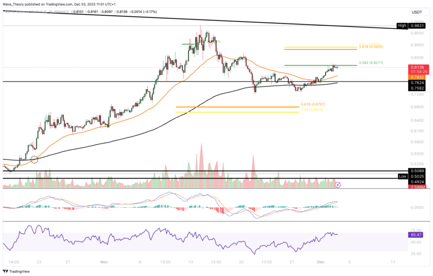 Indikator-indikator ini menunjukkan bahwa garis-garis MACD ini berpotensi akan bersilangan secara bearish. Tak hanya itu, kondisi ini juga mengindikasikan peluang terjadinya penolakan bearish pada level resistance Fibonacci 0,382 di sekitar US$0,821.