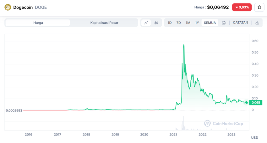 Dogecoin adalah koin meme pertama yang mendapatkan perhatian utama yang signifikan, mengukuhkan posisinya dalam sejarah pasar kripto.