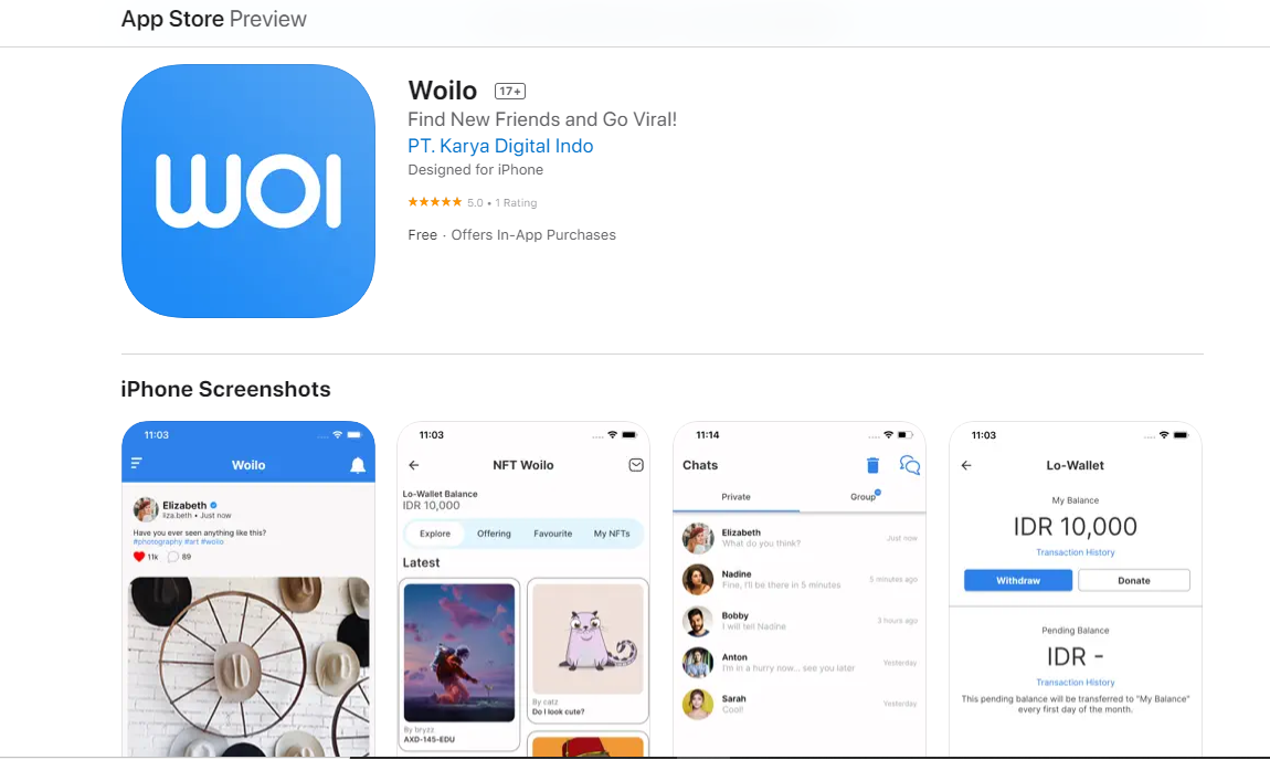 Woilo, platform jejaring sosial asal Indonesia, menjadi jejaring sosial pertama yang menyediakan layanan aset digital berupa non-fungible token (NFT). Platform yang berbasis di Surabaya itu baru saja merilis fitur NFT untuk membangun ekosistem kripto bagi para penggunanya.