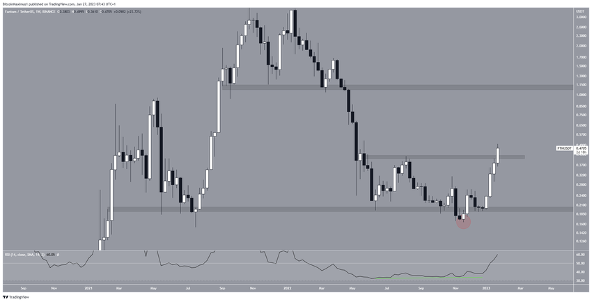 Saat ini, altcoin tersebut sedang dalam proses untuk mencapai penutupan candlestick mingguannya di atas level resistance US$0,41. Bila berhasil melakukannya, maka FTM bisa melanjutkan pergerakannya ke resistance berikutnya, yakni di US$1.10.