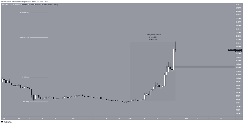 Token Apos (APT) telah meningkat 493% dari sejak awal tahun ini. Pada 26 Januari, APT mencetak level tertinggi sepanjang masa (all-time high) di US$20,400. Level tersebut sangat dekat dengan Fib retracement eksternal 2.61 dari penurunan sebelumnya. Di hari yang sama, altcoin ini menciptakan candlestick bearish shooting star.