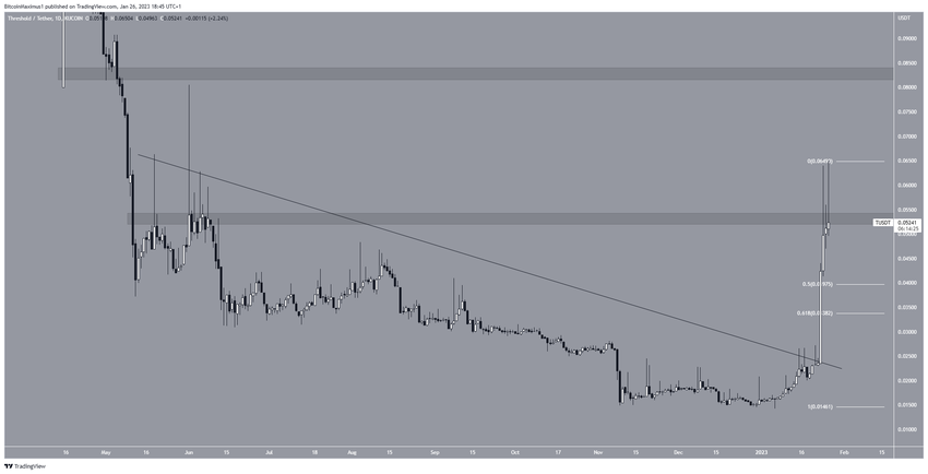 Pada 13 Januari, harga Threshold (T) menembus garis descending resistance. Lalu, 3 hari setelahnya, T mencapai level US$0,065. Namun, altcoin ini menciptakan sumbu atas (upper wick) panjang dan kini sedang diperdagangkan di kisaran US$0,053.