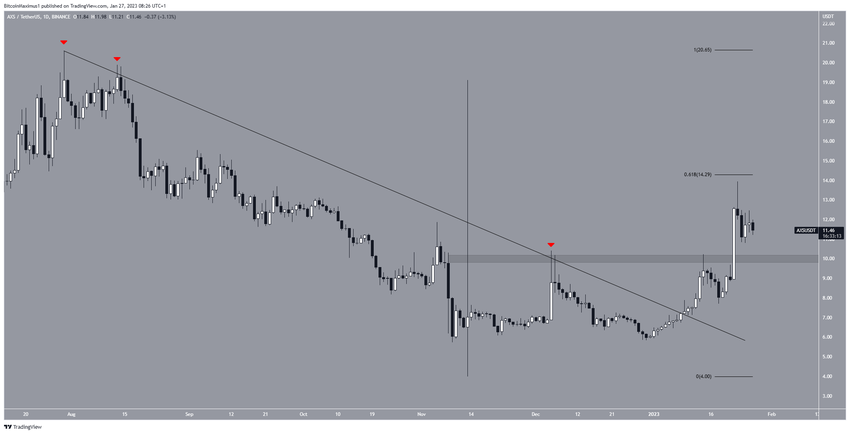 Harga AXS, native token dari proyek game Axie Infinity, telah menembus garis descending resistance di tanggal 6 Januari. Sejak saat itu, AXS pun terus bergerak naik, dan pada 22 Januari bergerak di atas area resistance horizontal di US$10. Area tersebut kini diperkirakan akan menjadi support.
