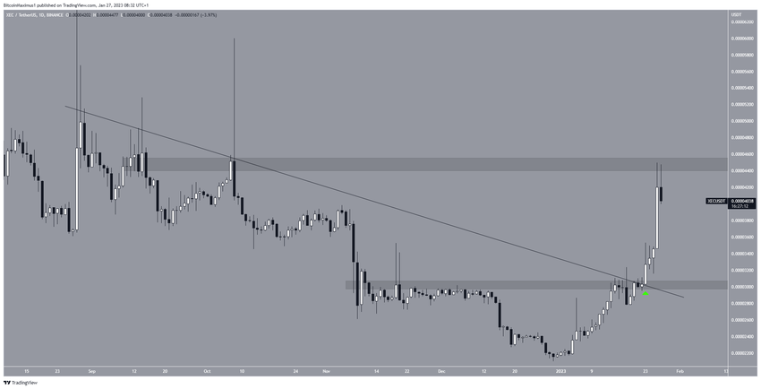 Sama seperti APT dan AXS, harga eCash (XEC) juga mengalami breakout dari garis descending resistance pada 23 Januari. Pergerakan naiknya berlanjut, dan tiga hari setelahnya, harga XEC mencapai level US$0,000045.