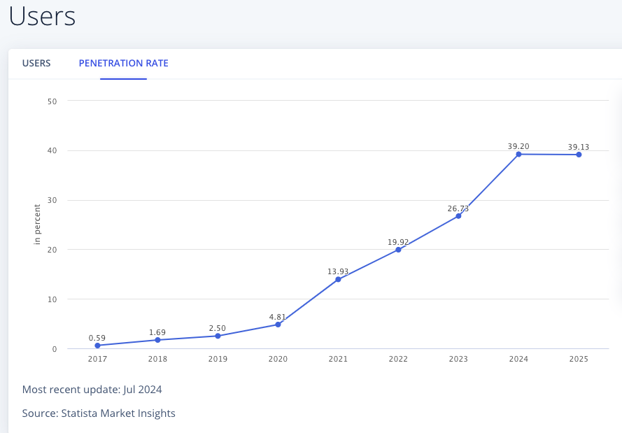 Karena pendekatan yang ramah kripto, UEA memiliki tingkat adopsi yang signifikan. Menurut Statista, pada Juli 2024, terdapat 39,13% penetrasi kripto di UEA.