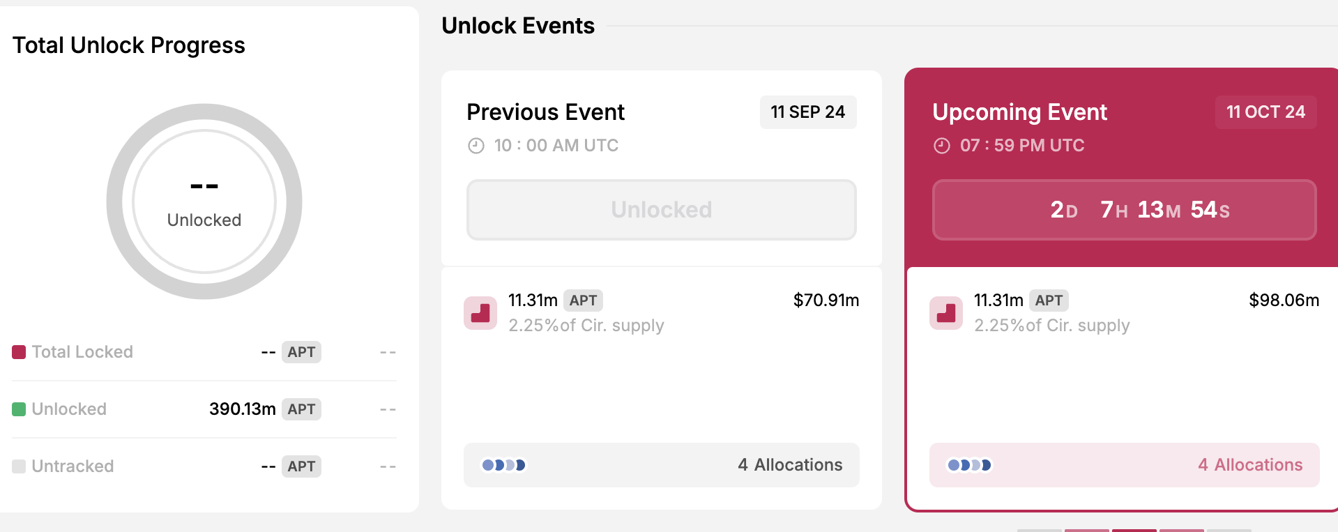 Menurut data dari Token Unlocks, Aptos akan merilis 11,31 juta token pada 11 Oktober. Jumlah ini mewakili 2,25% dari total pasokan maksimumnya. Dengan level harga altcoin saat ini, token-token ini bernilai nyaris US$100 juta.