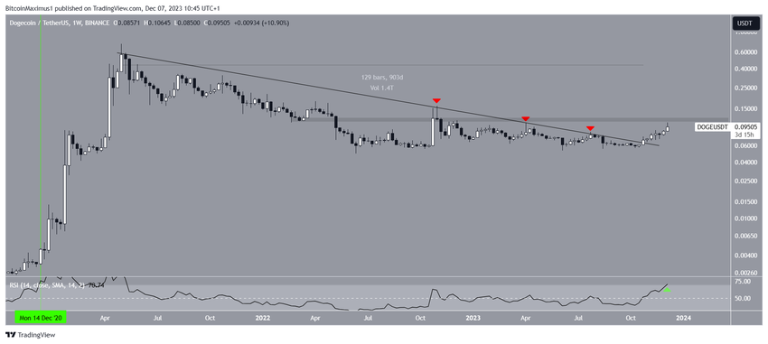 Analisis teknikal pada time frame mingguan mengungkapkan bahwa harga DOGE telah berhasil breakout dari garis tren descending resistance yang sudah ada selama lebih dari 900 hari pada bulan Oktober.