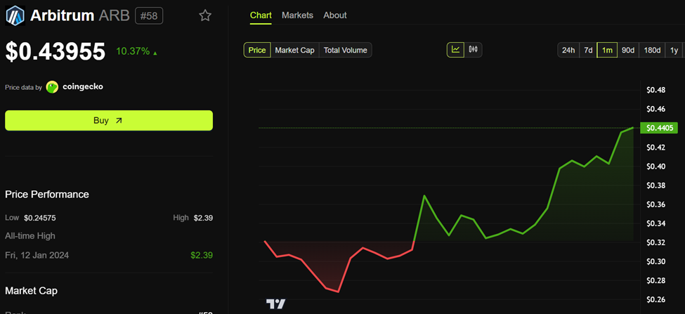 Pada waktu publikasi, ARB diperdagangkan seharga US$0,4395, naik 10,37% dalam 24 jam terakhir. Data CoinGecko menunjukkan bahwa ini adalah top gainer ketiga di antara 60 aset kripto teratas, setelah Pump.fun (PUMP) dan Pudgy Penguins (PENGU).