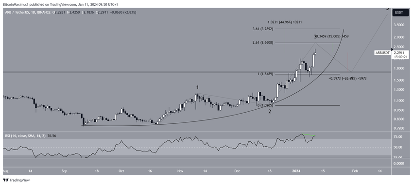 Jadi, level pertama untuk puncak lokal adalah di angka US$2,65, atau 15% di atas harga saat ini. Jika gelombang tiga mengalami perpanjangan lebih lanjut dan akhirnya memiliki 3,61 kali panjang gelombang satu, ARB berpotensi meroket sebesar 45% menuju resistance selanjutnya di US$3,28.