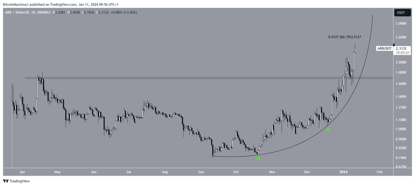 Baru setelah itu, ARB mampu mempercepat laju kenaikannya. Pada awal tahun 2024, ARB berhasil menembus resistance ATH sebelumnya di angka US$1,70 dan sekaligus memvalidasinya sebagai support. Sejak saat itu, harga ARB telah menanjak sebesar 60%, berpuncak pada rekor ATH baru di harga US$2,42 kemarin.