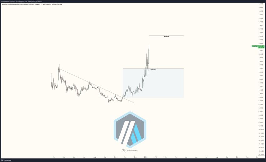 Harga Arbitrum (ARB) telah melesat dengan pesat pada tahun 2024. Bahkan, aksi naik ini berhasil mencetak rekor baru harga tertinggi sepanjang masa (ATH) di level US$2,42 pada hari Kamis (11/1).