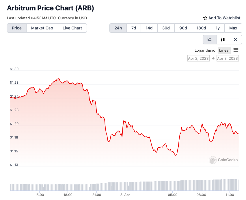 Berdasarkan data CoinGecko, harga token ARB ‘sempat’ turun sekitar 10% dalam 24 jam terakhir. Bila dihitung sejak 31 Maret hingga 3 April, harganya telah jatuh 19%. Saat ini harga ARB berada di sekitar level US$1,19.