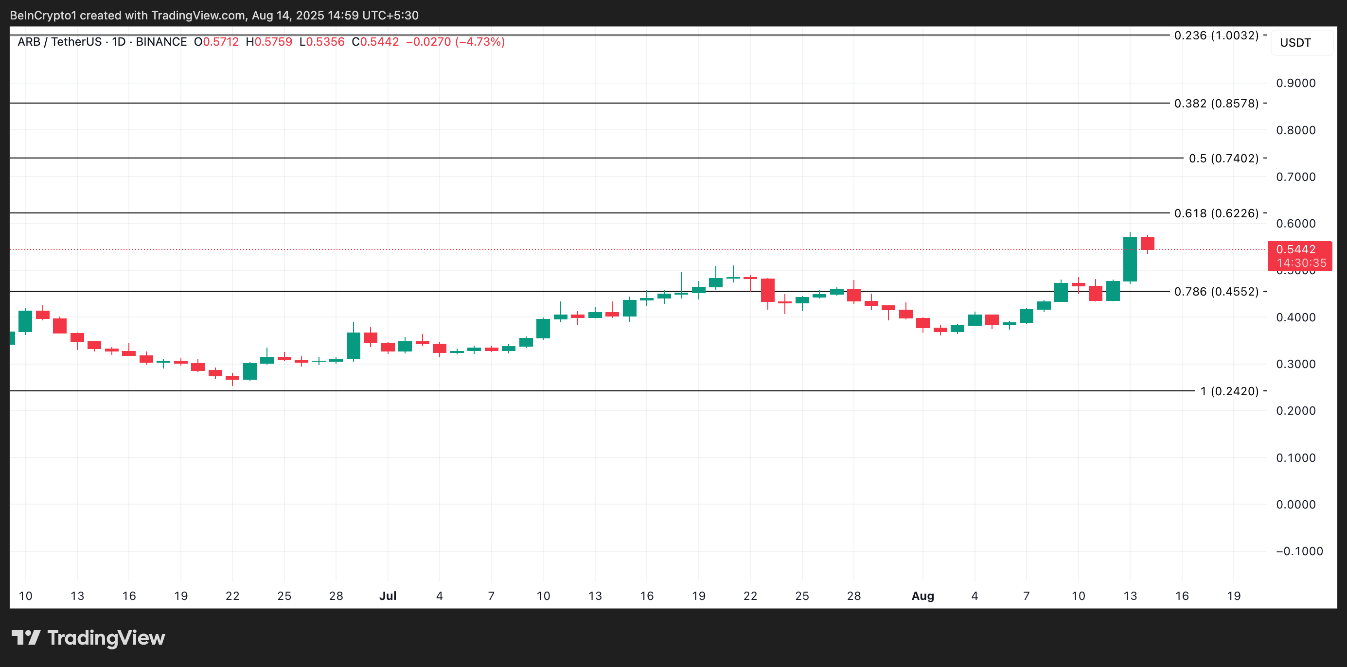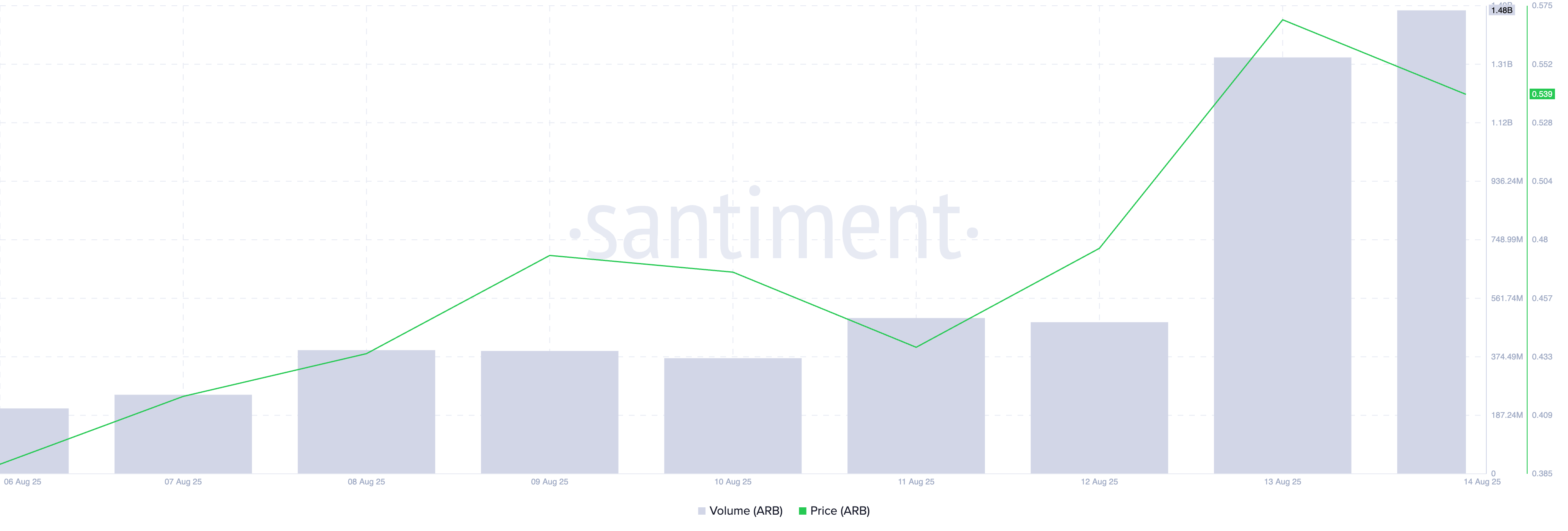 Pada saat publikasi, ARB diperdagangkan pada US$0,54, naik sebesar 12% dalam 24 jam terakhir. Selama periode tersebut, volume perdagangannya naik sebesar 155% dan saat ini mencapai total US$1,48 miliar.
