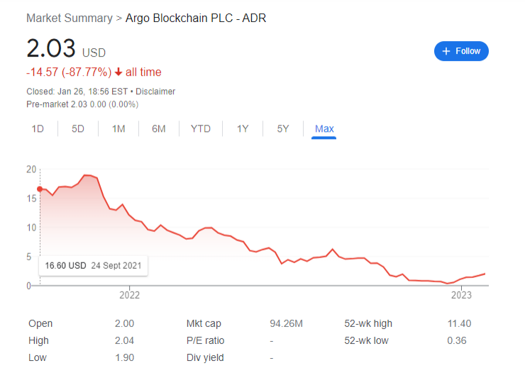 Sebelumnya, di 16 Desember 2022, Argo Blockchain mendapatkan peringatan dari Nasdaq bahwa harga saham biasa perusahaan tidak boleh berada di bawah harga penawaran miminum, US$1 selama 30 hari kerja berturut-turut. Hal tersebut sesuai dengan Aturan Pencatatan Pasar Saham Nasdaq.
