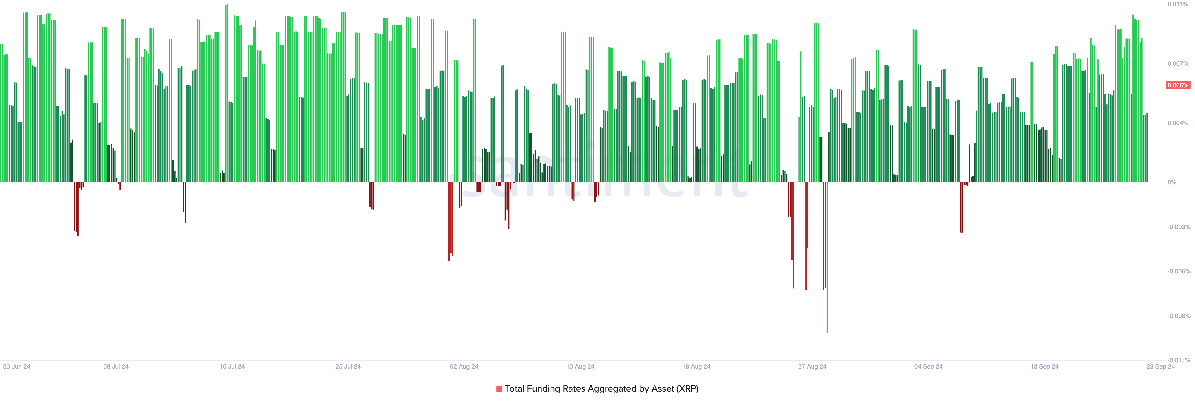 Menurut Santiment, funding rate XRP telah tetap positif sejak 7 September, menunjukkan sentimen pasar yang bullish. Funding rate positif mencerminkan permintaan yang lebih tinggi untuk posisi long, dengan trader bersedia membayar premi untuk mengantisipasi kenaikan harga.