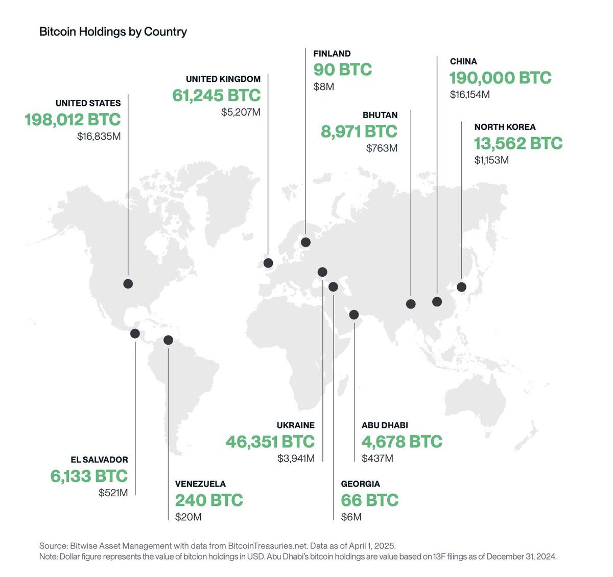 Menurut laporan Bitwise Investments, El Salvador saat ini memiliki 6.133 BTC, yang bernilai US$521 juta. Sementara itu, Cina memiliki 190.000 BTC yang bernilai hampir US$16,1 miliar meskipun melarang perdagangan aset kripto. Memimpin adalah Amerika Serikat, dengan 198.012 BTC yang bernilai sekitar US$16,8 miliar.