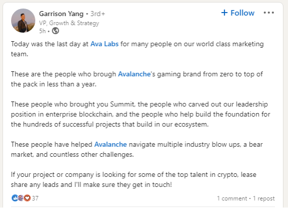 “Hari ini adalah hari terakhir bagi banyak orang di tim pemasaran kelas dunia kami. … Orang-orang ini telah membantu Avalanche menavigasi berbagai ledakan industri, bear market, dan berbagai tantangan lainnya yang tak terhitung,” ungkap Yang.