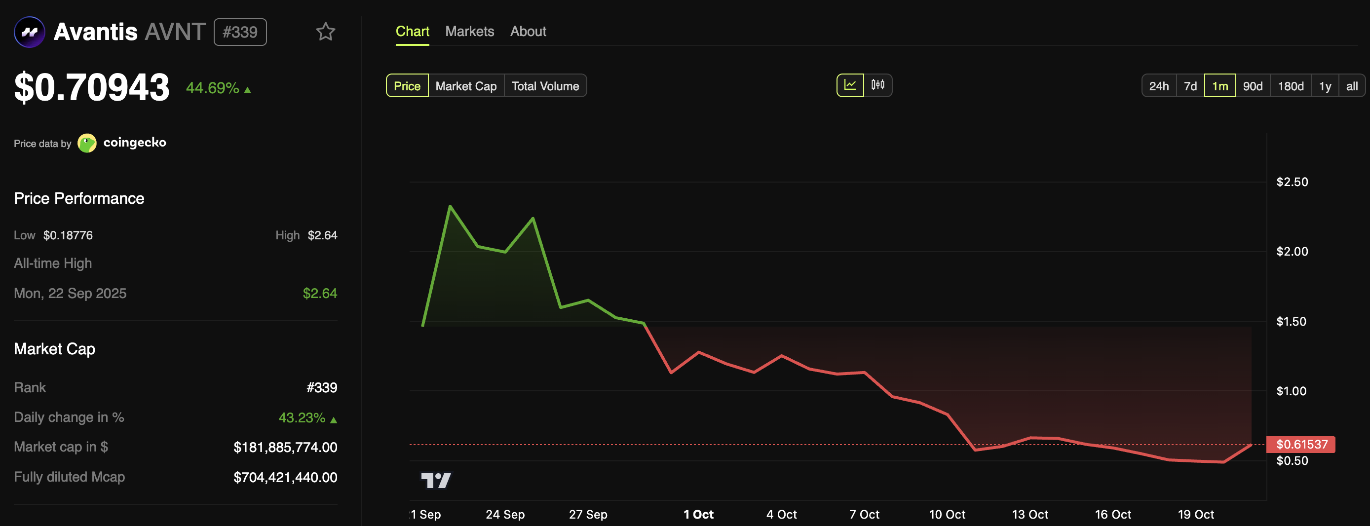 Menurut data BeInCrypto Markets, AVNT telah naik 44,69% dalam 24 jam terakhir. Pada waktu publikasi, token ini diperdagangkan pada harga US$0,70.