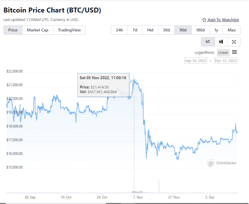 Dalam asumsi B. Riley, disebutkan bahwa harga Bitcoin berada di kisaran US$18.500. Namun, sejatinya tidak ada yang bisa memastikan kapan BTC akan kembali ke harga yang menarik. Jika melihat pergerakan harga BTC selama 90 hari kebelakang, Bitcoin sempat diperdagangkan di level US$21.414 pada 5 November lalu.