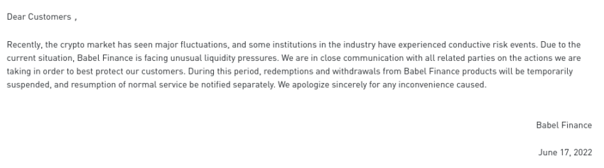 Babel Finance, sebuah platform layanan keuangan untuk investor kripto dan miner, baru saja mengumumkan melalui pernyataan resmi bahwa mereka menangguhkan penarikan bagi para pengguna.