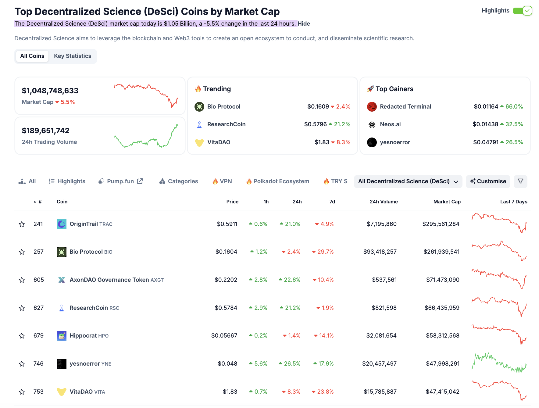 Menurut CoinGecko, kapitalisasi pasar DeSci adalah US$1,05 miliar pada waktu publikasi. Selama setahun terakhir, sektor ini telah menunjukkan pertumbuhan yang stabil dan inovasi yang konstan. Banyak proyek baru dengan cepat menjadi pemain utama.