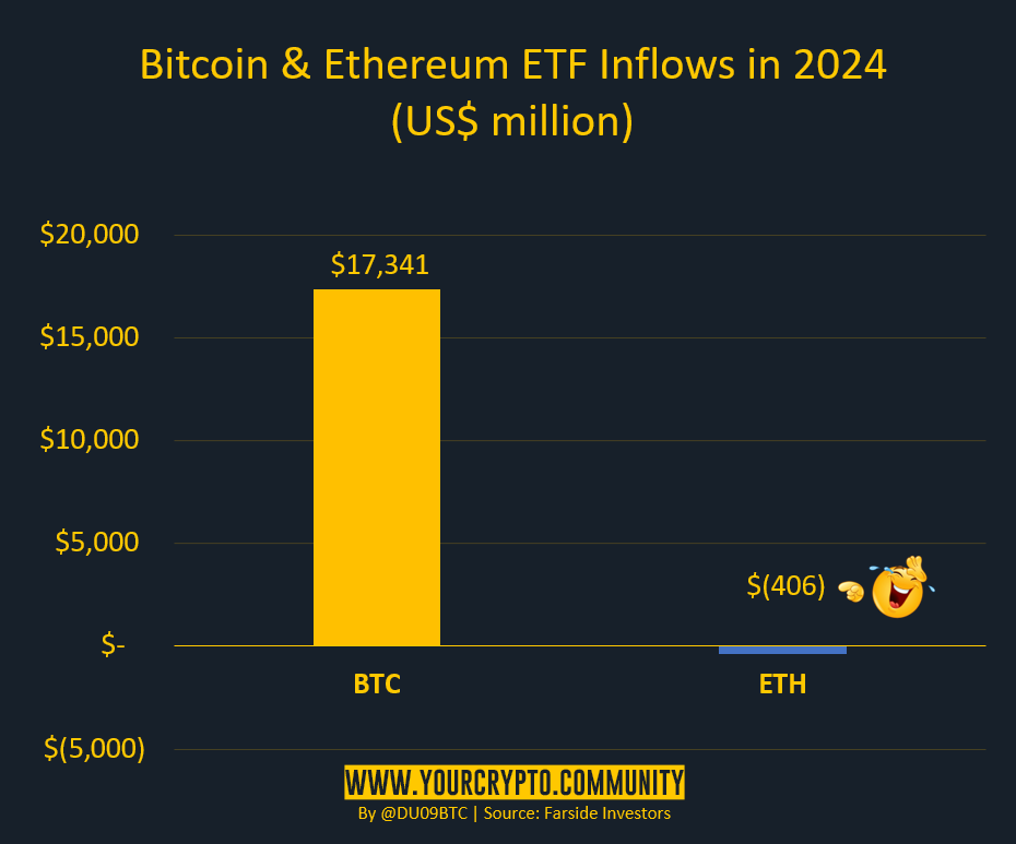 Sponsored Sponsored“Sejak Januari 2024, ETF Bitcoin berhasil menarik investasi bersih lebih dari US$17 miliar setelah aksi jual oleh Grayscale. ETF Ethereum memulai debut pada Juli. Saldo bersihnya? Minus US$406 juta,” tulis sang analis.