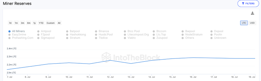 Sehubungan dengan aksi akumulasi tersebut, data on-chain dari IntoTheBlock menunjukkan bahwa miner LTC mulai menambahkan cadangan mereka pada Juni 2023, ketika mereka menambahkan 310.000 LTC, senilai sekitar US$30 juta.