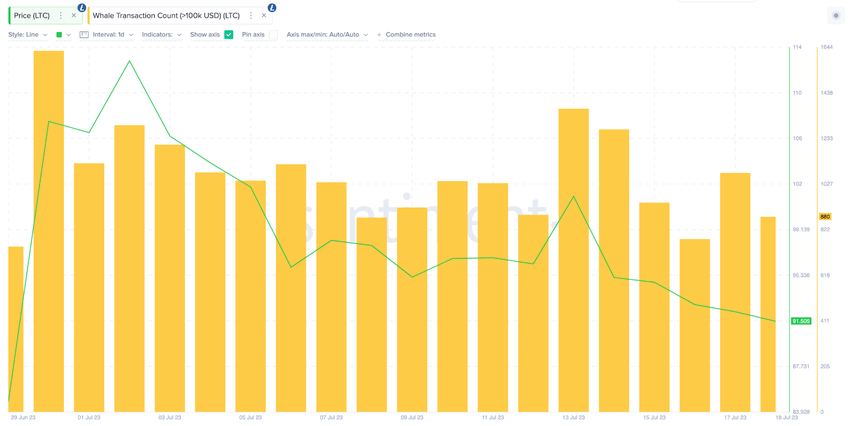 Grafik di bawah ini menunjukkan bagaimana Whale Transaction Count LTC (100rb) telah berkurang dari 1.628 transaksi whale yang tercatat pada 30 Juni menjadi hanya 880 transaksi pada penutupan tanggal 19 Juli.