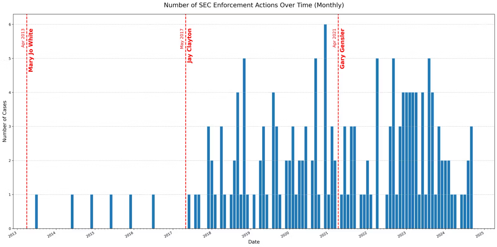 Tindakan ini mencakup tiga masa jabatan presiden dan tiga ketua SEC yang dikonfirmasi. Hampir setengah dari mereka—88 kasus—terjadi di bawah kepemimpinan Gensler.